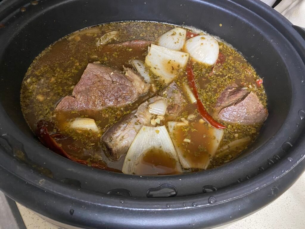 - In a slow cooker, add: beef broth, water, apple cider vinegar, cinnamon stick, olive oil, garlic, Mexican oregano, smoked paprika, bay leaves, salt, pepper, ground ginger, ground coriander, ground thyme, ground cumin, and the white onion chunks.